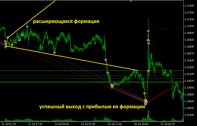- Затруднения в работе может вызвать структура рынка в виде «расширяющейся формации» (Рисунок 1). Алгоритм решает и такие задачи успешно, но на них требуется больше времени. В этом случае комбинация положительной и отрицательной обратной связи в комбинации с робастностью метода, дают выход на торговое решение. Убедиться в этом можно на Рисунке 2.