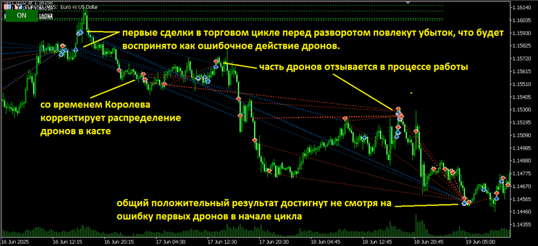 - Ранее проводились эксперименты, где первый дрон активировался по графической модели, по различным индикаторам и даже по генератору случайных числе от 1 до 100 (четное – покупка, нечетное продажа). Дальше торговля шла на анализе общего вектора. Результаты показали, что итоговый результат не зависит от методики активации первого дрона. Первый дрон лишь запускает череду сделок, число вариаций которой стремится к бесконечности. Пример устойчивости к ошибкам продемонстрирован на Рисунке 3.
